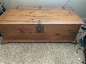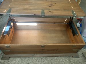 This very nice gently used coffee table with a lift top has a lot of room for storage.Tabletop = 50.5” length x 24” width