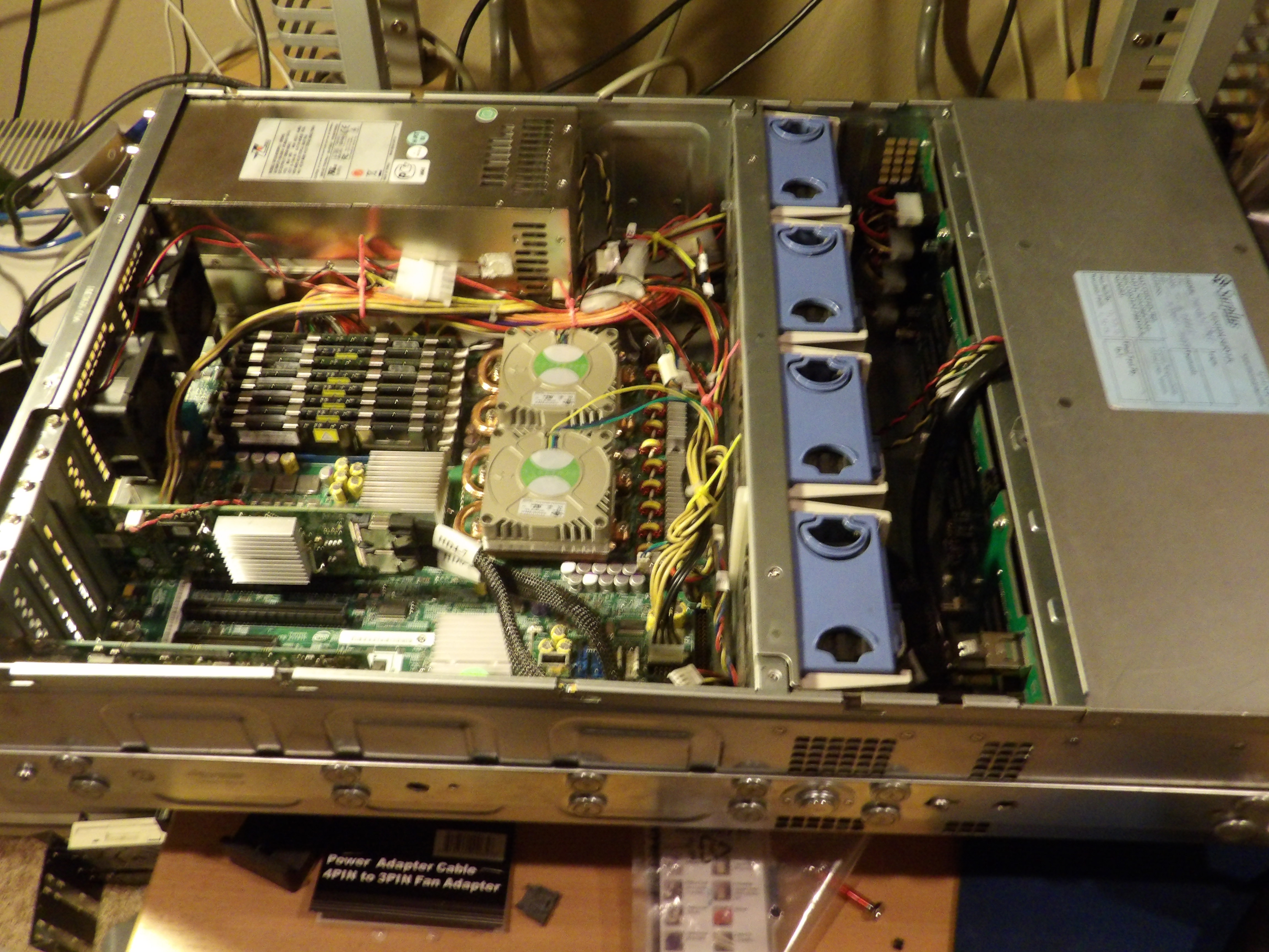 Well this was quite the overhaul! I had to customize and drill some additional holes into some old rails (get new cobalt bit from Home Depot) I have, got some smaller  screw heads since this new case was a bit wider, jump over to Fry’s get some cables to take internal fans from 4 pin to 3 pin then get that heavy beast up in the rack and cabled. I also had to take the chassis out to the garage and clean it since i got it used. I also added a couple of 50mm fans at the back of the case in addition to the 4 high volume fans that came with the case