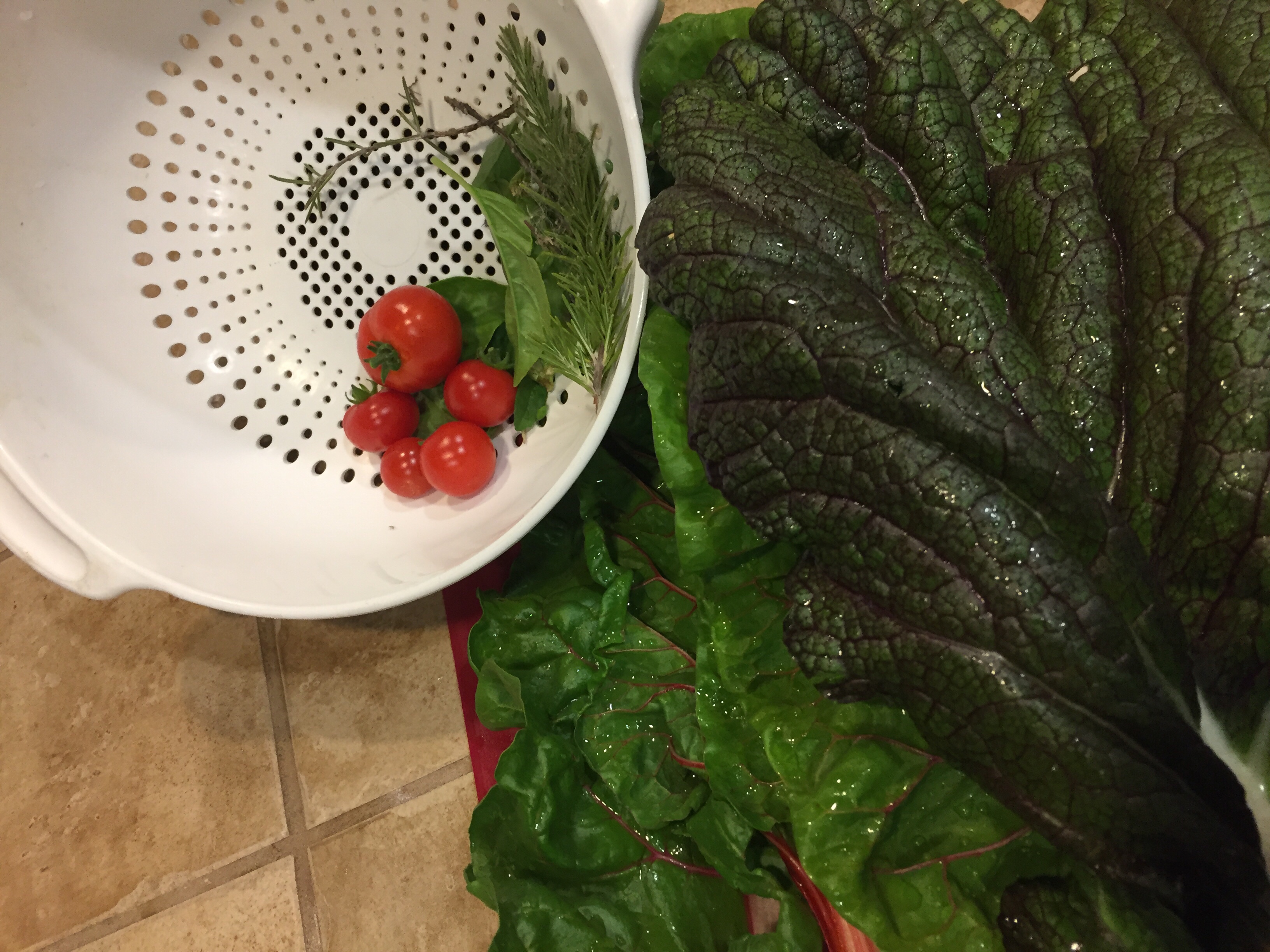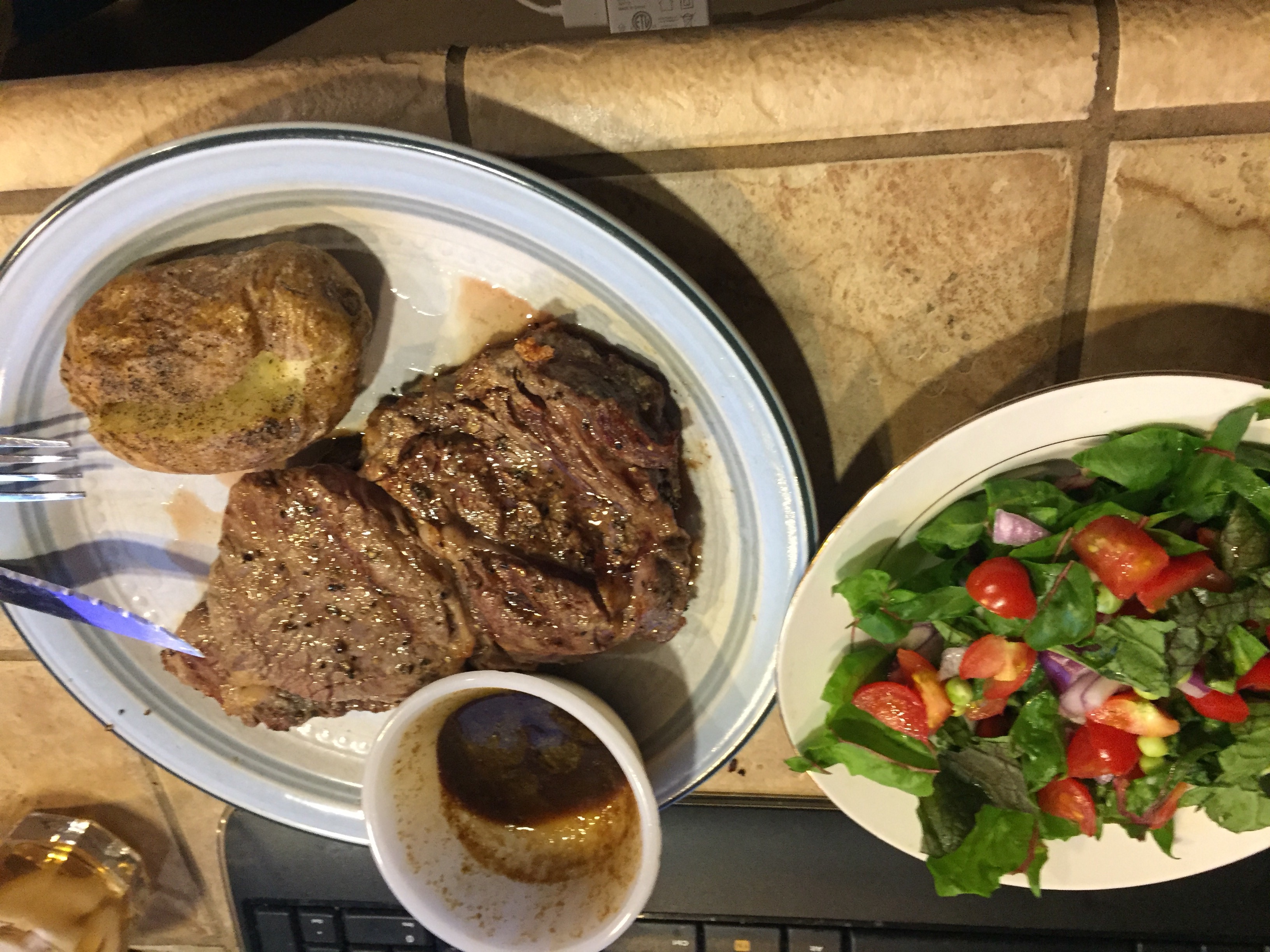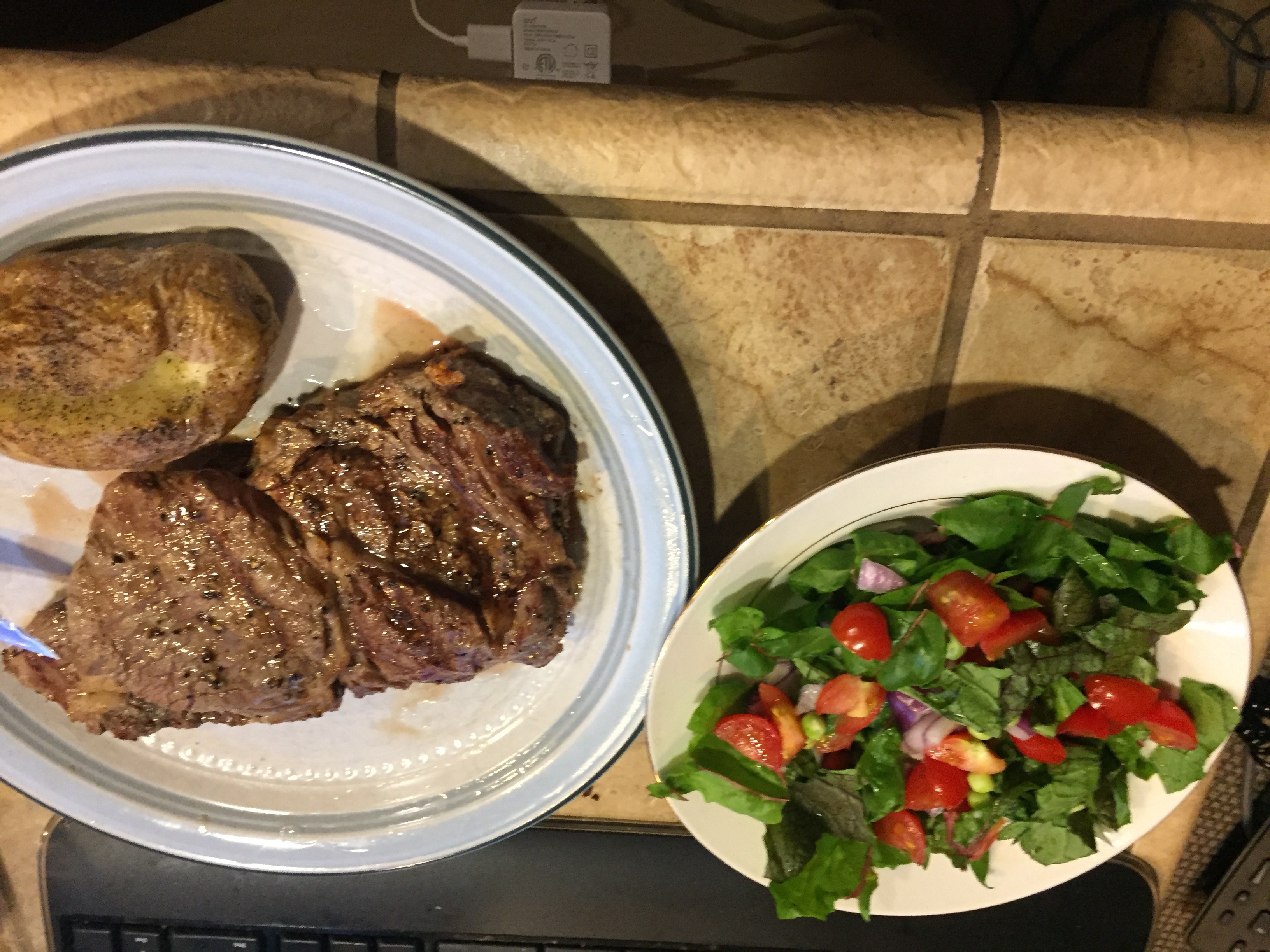 My first tomatoes of the season were some delicious cherry tomatoes I put in a salad with Swiss chard, basil,romaine lettuce, sweet purple onions and mustard greens all from my garden. Together with a baked potato and ribeye steak cooked to medium with my homemade dipping sauce for the steak was a great meal including 805 beer and Crown whisky as beverages.
