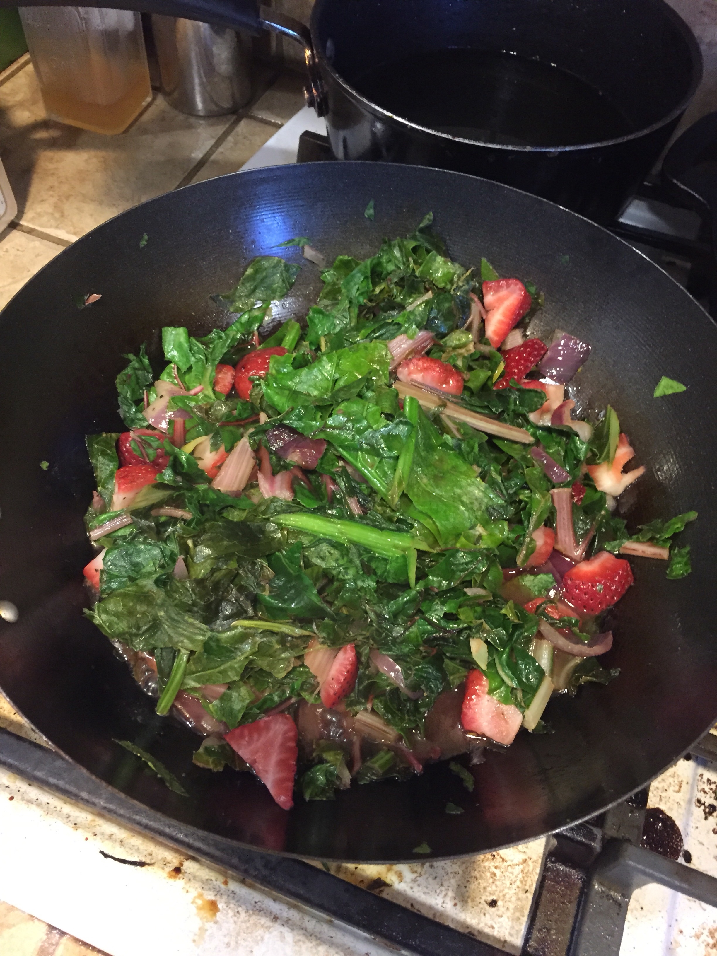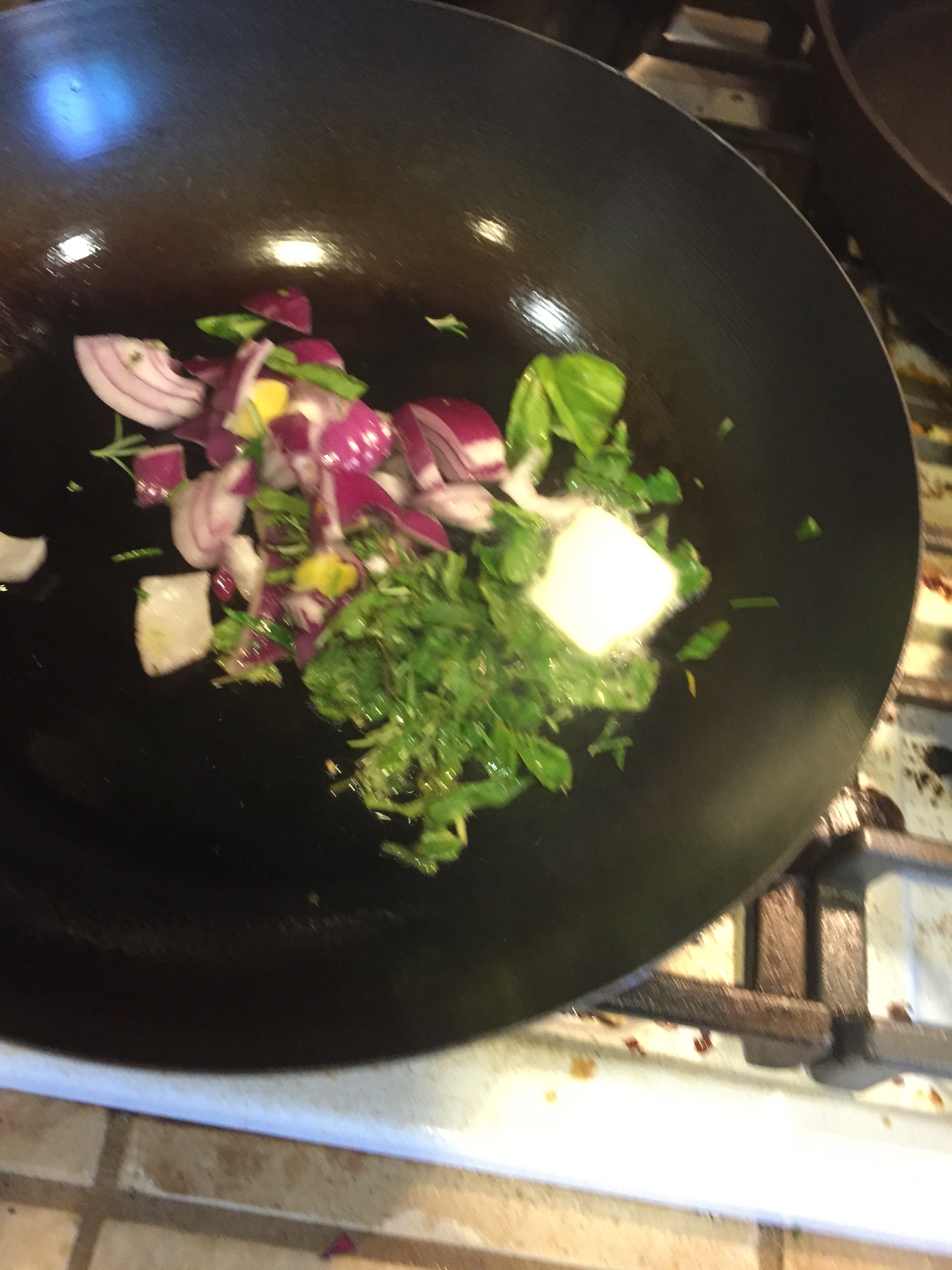 Swiss chard, mustard greens, collards, basil, onion, rosemary, mint chopped up.