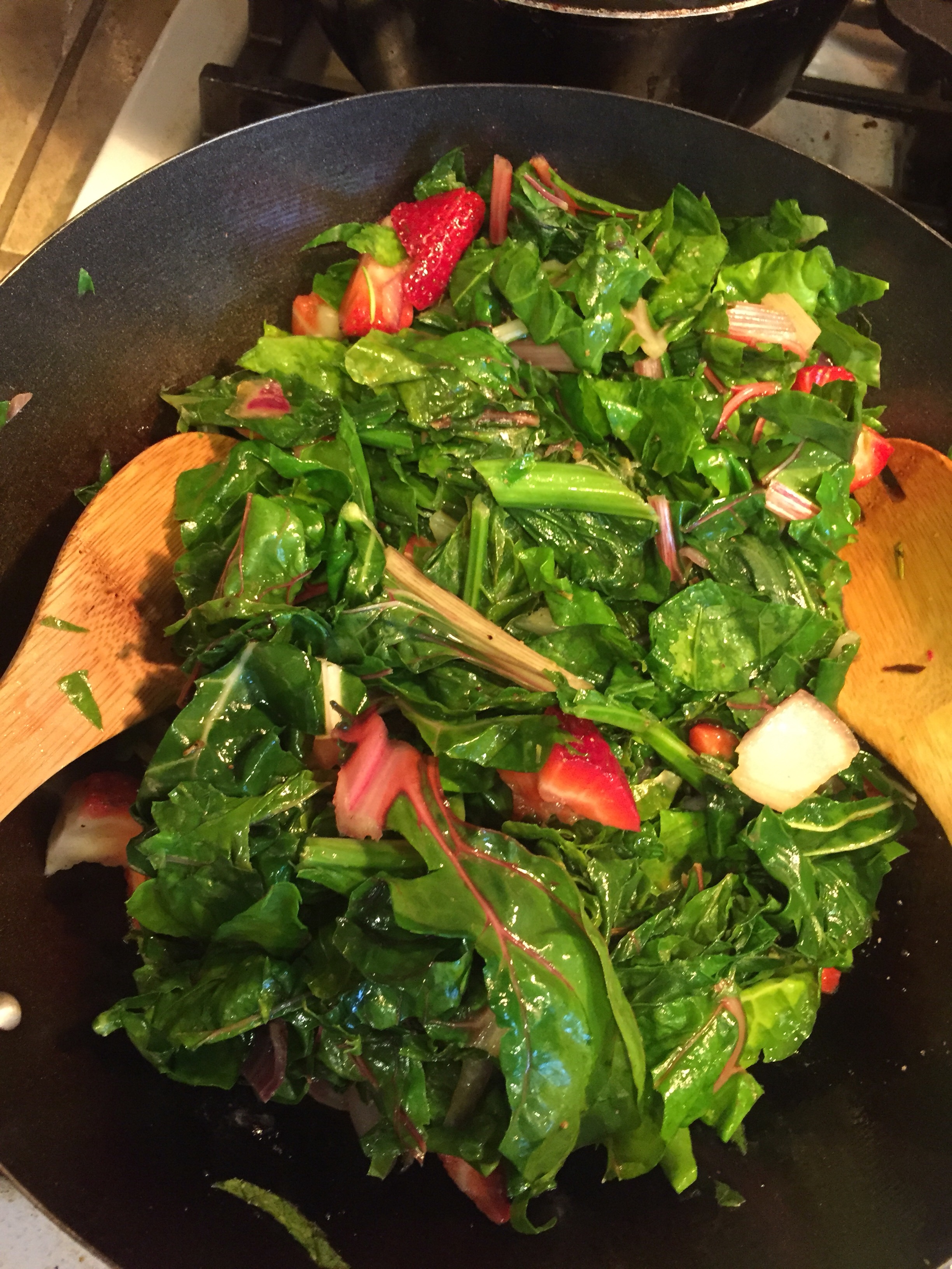 Swiss chard, mustard greens, collards, basil, onion, rosemary, mint getting prepped.