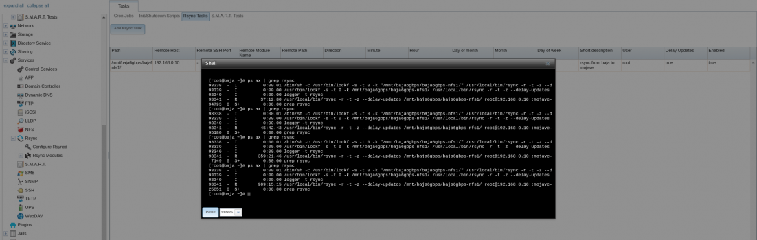 There is no way to monitor the “rsync” progress from the FreeNAS GUI so you will have to ssh into the server or bring up the shell in the GUI and perform a “ps ax | grep rsync” to see the progress. I am also monitoring the directory growth via my Centos 7 system that accesses all my networks and I have the NFS filesystems of each FreeNAS mounted to. This also reminded me I needed to grow my second FreeNAS system’s NFS volume and did this via the GUI striping in 2 spare 3TB SAS disks I had while still running rsync to this volume