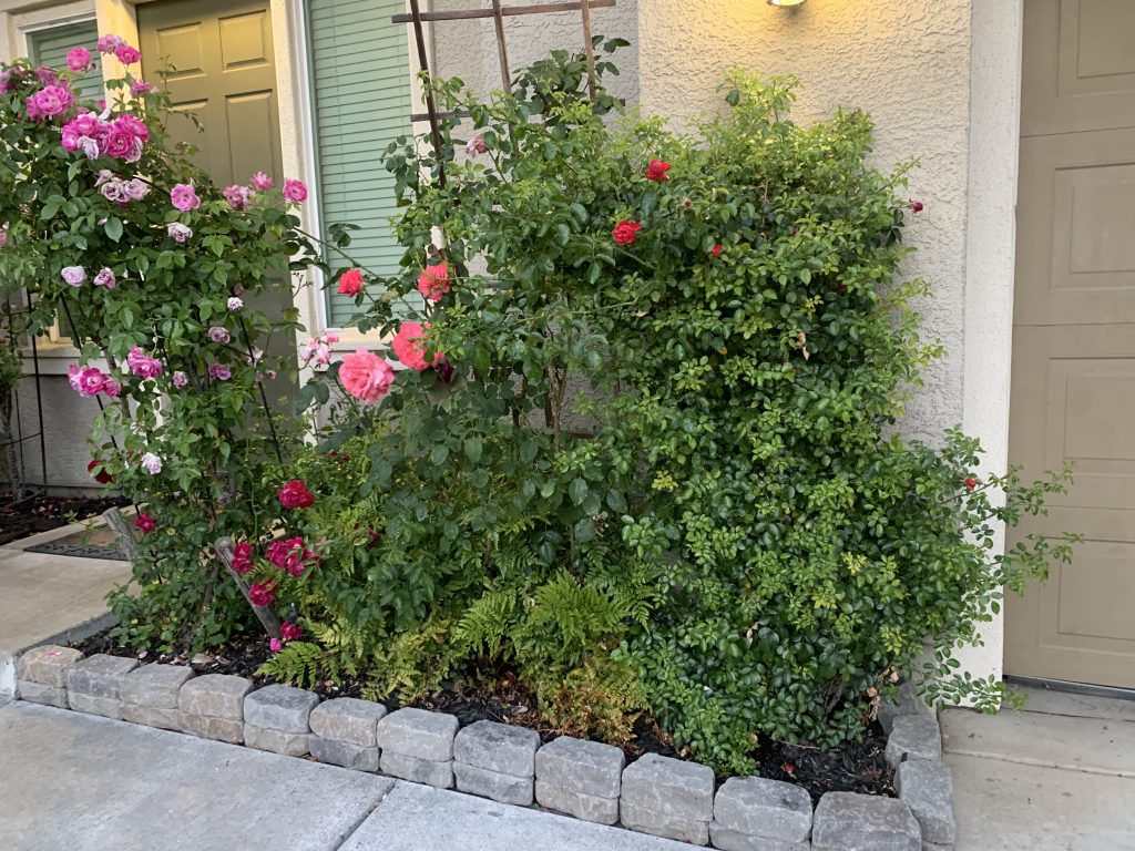 Roses and ferns front yard near garage.