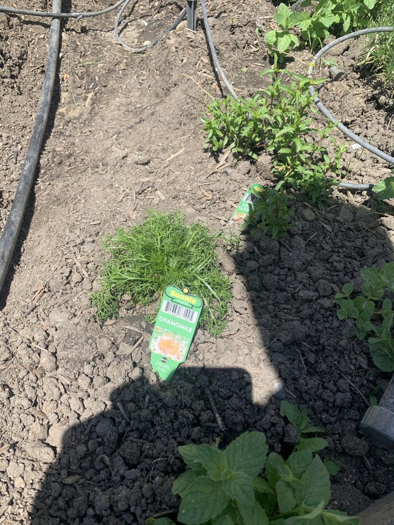 Newly planted chamomile next to Mexican tarragon and mints.