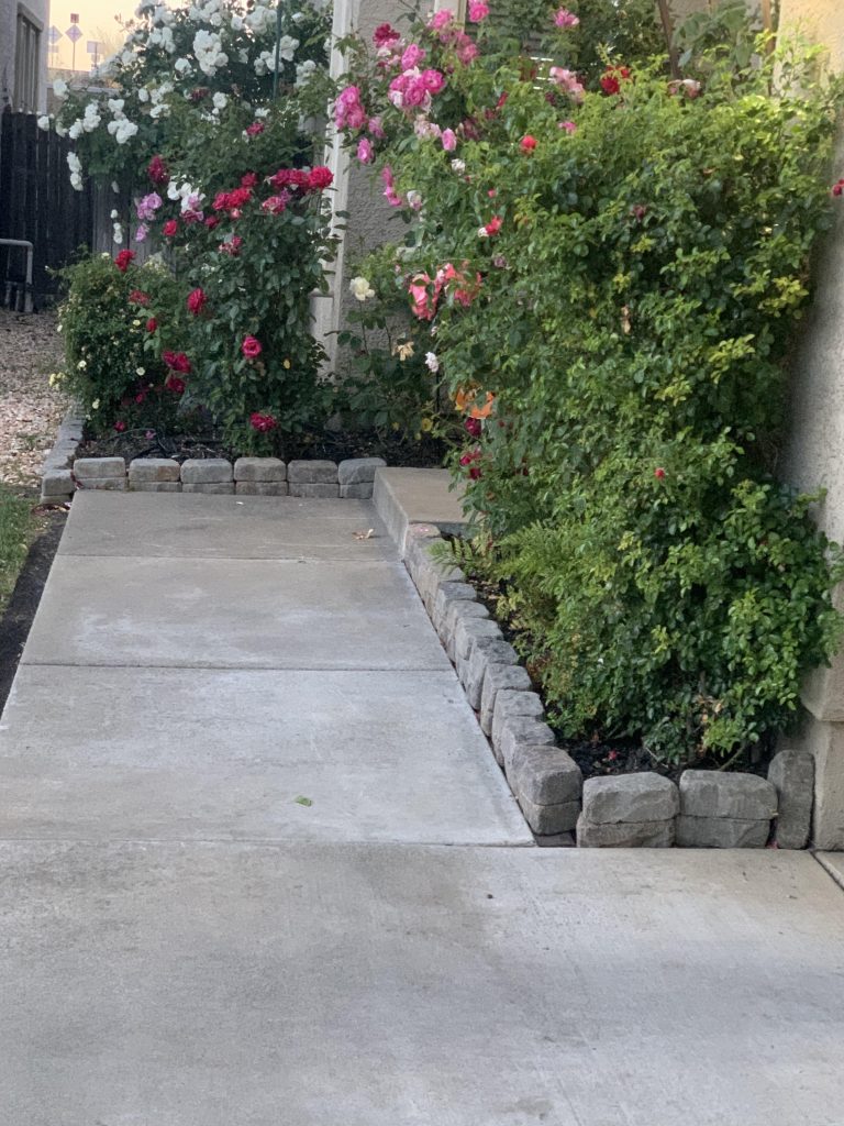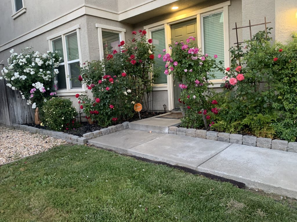 Shot down the short sidewalk in front of my house of my roses.