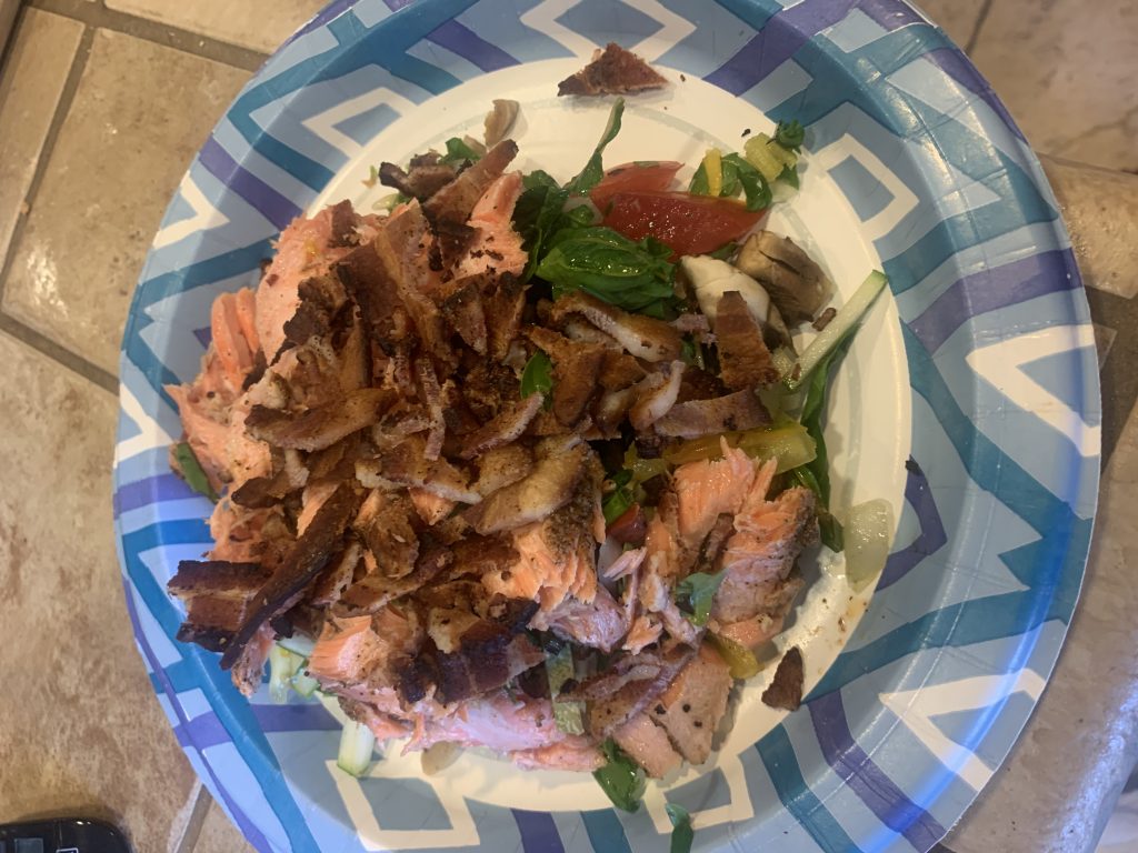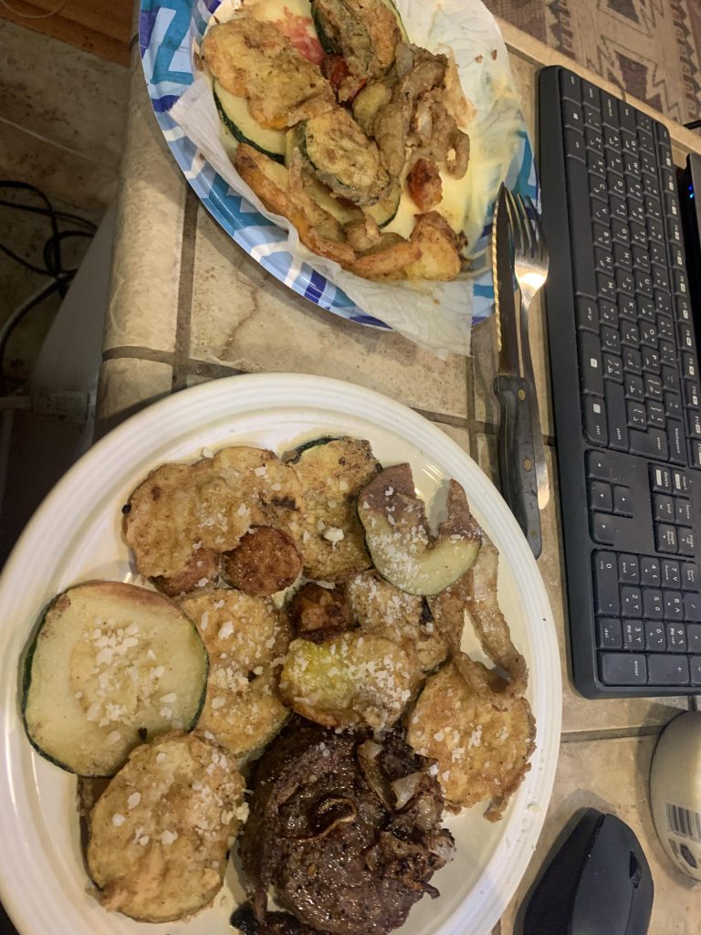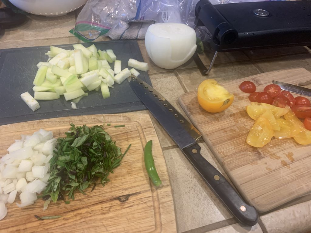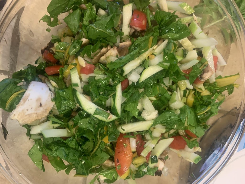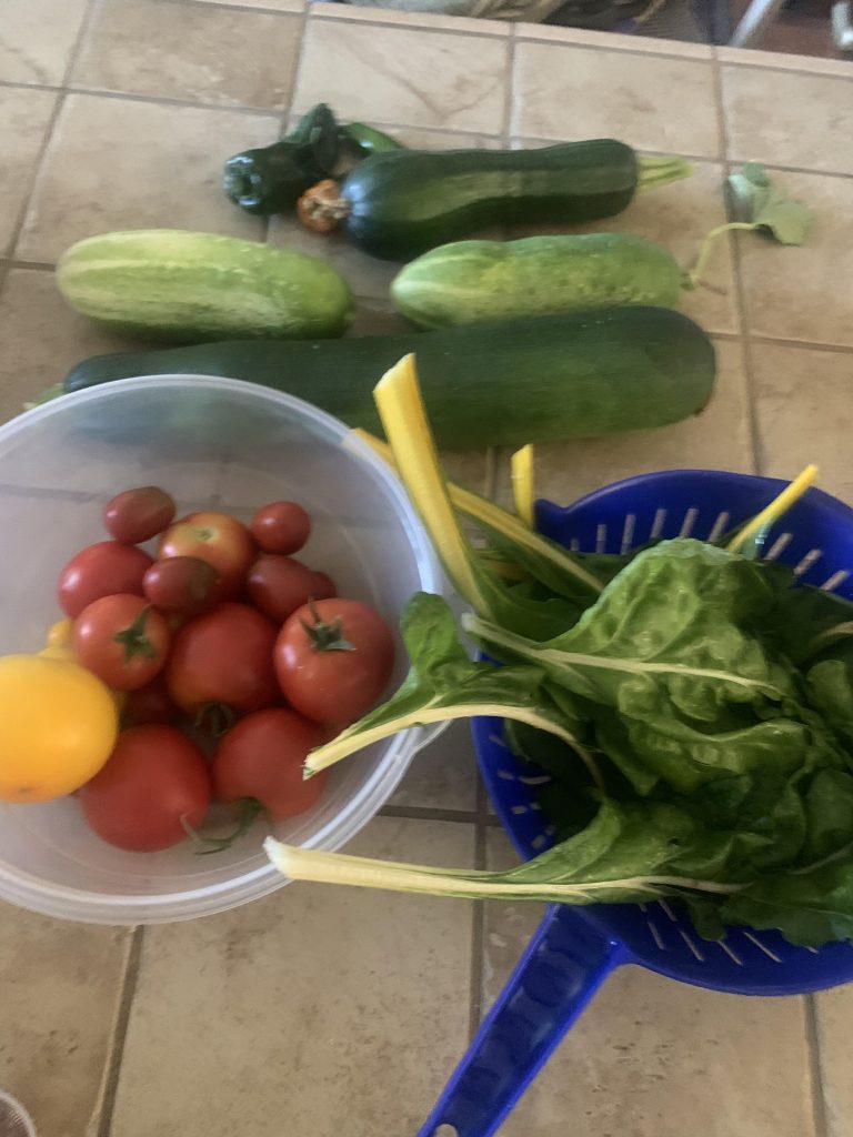 I made a salad of squash, cucumber, Swiss chard, lemon boy, black pearl,