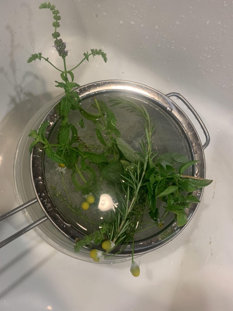 gathered up my herbs of mint, basil, sage, lemon thyme, rosemary, I forgot my