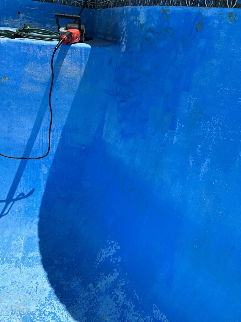 I had to wait a while after taping the pool off for painting. I did light washing with the hose pipe and not pressure wash to get surface dirt after doing some patching of cracks and areas when someone dropped a heavy object in the empty pool. I then waited an extra day and painted!